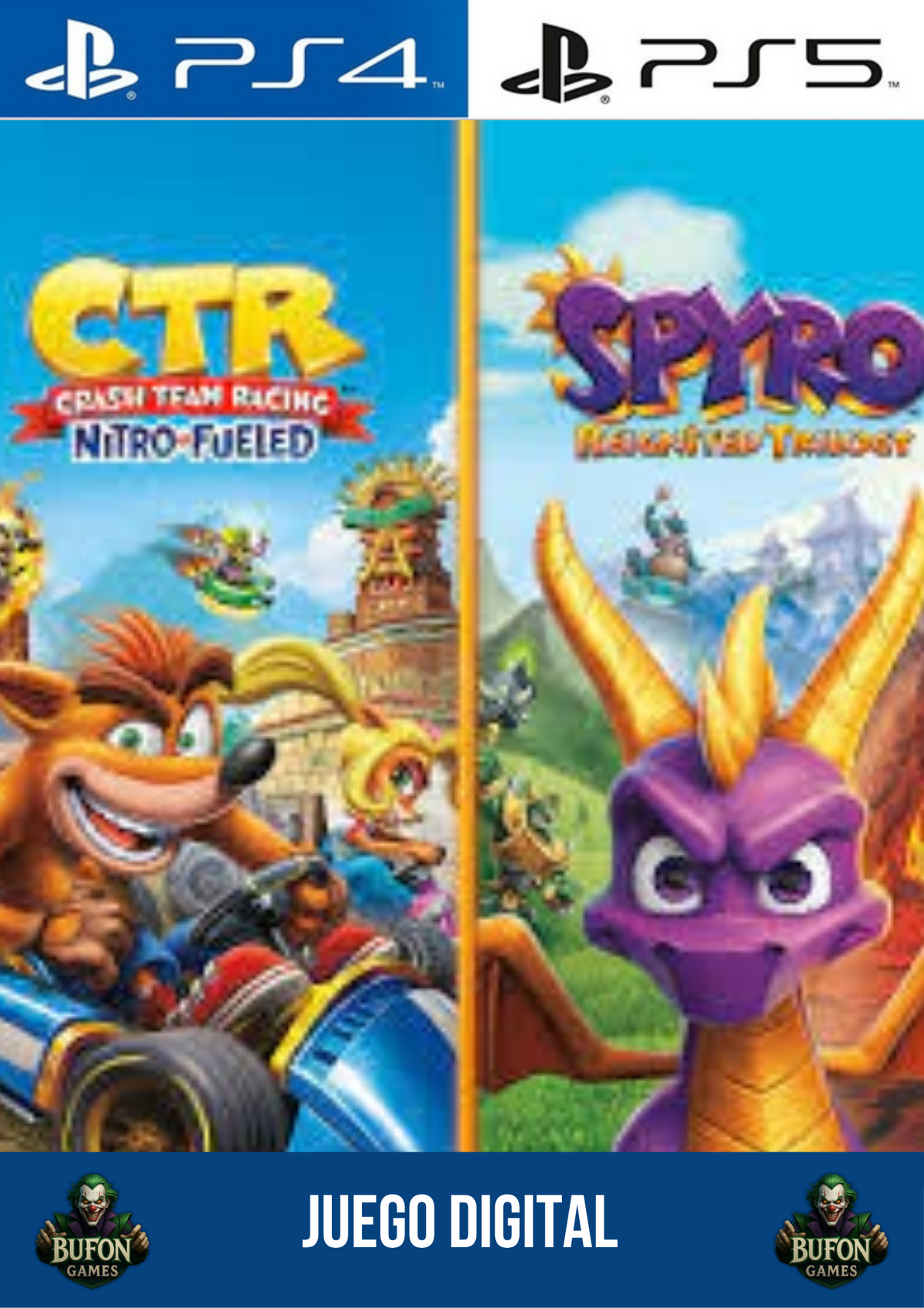 Disfrutá lo mejor de dos mundos en un solo paquete explosivo. Por un lado, viví la velocidad y locura de Crash Team Racing Nitro-Fueled, con carreras frenéticas, power-ups impredecibles y personajes legendarios listos para competir en pistas desafiantes 🚗💥. Por otro, sumergite en las mágicas aventuras del dragón Spyro, explorando mundos coloridos llenos de secretos y desafíos épicos 🐉✨.