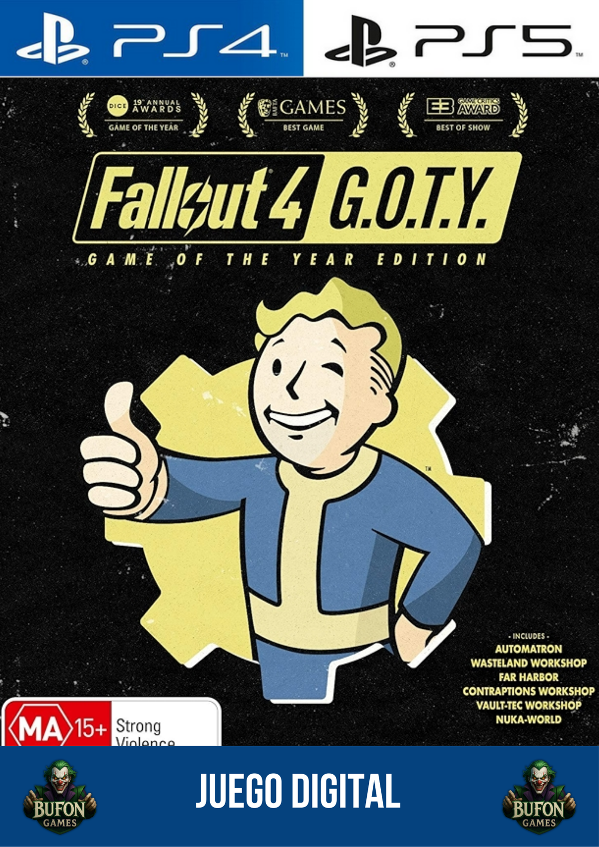 Incluye todos los DLCs oficiales, lo que significa aún más contenido, misiones, locaciones y posibilidades de personalización. Es la experiencia Fallout definitiva.